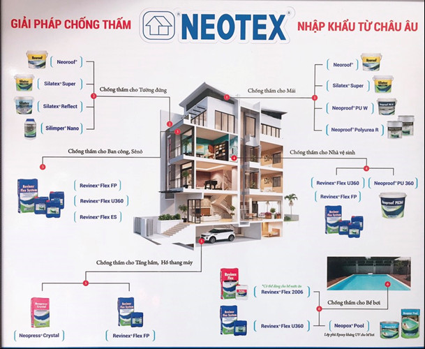 Khuấy kĩ sản phẩm trong thùng của nó. Sau khi quét lót, quét/lăn tối thiểu 2 lớp Neoroof® theo hai hướng khác nhau. Lớp thứ nhất pha với 5-10% nước. Quét/lăn lớp thứ hai sau lớp thứ nhất 24 giờ, không pha loãng. Lớp thứ ba cũng được thi công theo hướng dẫn trên.Trường hợp ứng dụng trên màng asphalt, quét 1-2 lớp lót Revinex® pha với nước theo tỷ lệ Revinex®: nước –1:3, tiếp theo quét ít nhất 2 lớp Neoroof®.