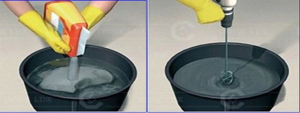 - Đổ phần cô đặc của dung dịch từ thùng chứa vào thùng trộn và trộn bằng máy ở tốc độ chậm (350-450 vòng/phút). Từ từ đổ phần bột vào thùng chứa thành phần dung dịch để tránh vón cục và trộn trong vòng từ 4-5 phút cho đến khi đạt độ mịn và dẻo theo yêu cầu. Nên trộn lượng vật liệu đủ dùng trong thời gian thi công.