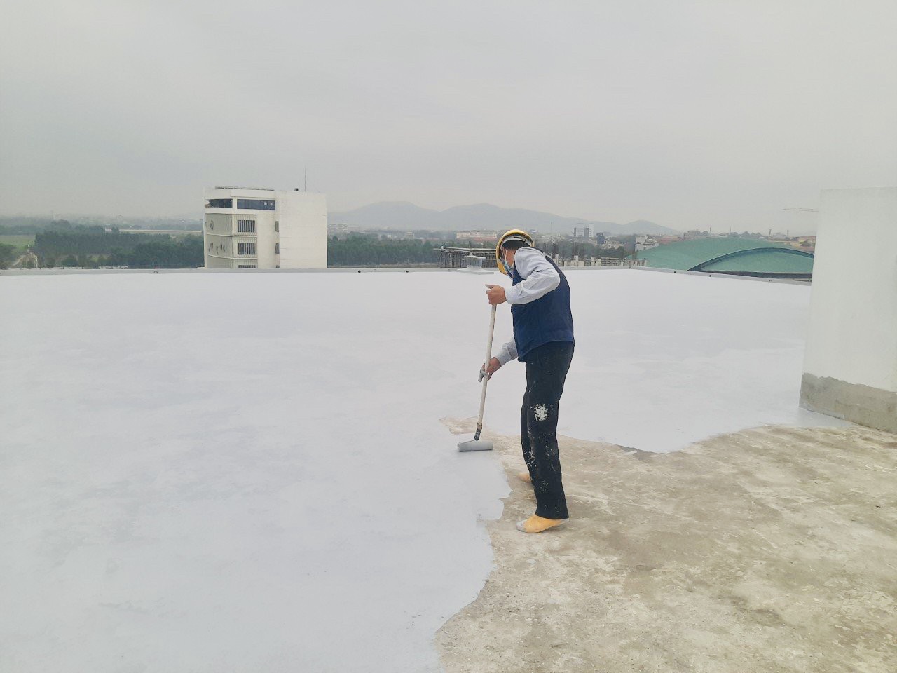 - Sau 24 giờ khi lớp thứ nhất đã khô, tiến hành thi công lớp thứ hai với thao tác giống lớp thứ nhất (nhưng không pha nước), hướng vuông góc so với lớp đầu tiên. Định mức 0.6 - 0.75 kg/m2 lên toàn bộ nền và chân tường mái, chân tường mái quét bo lên 30 cm.
