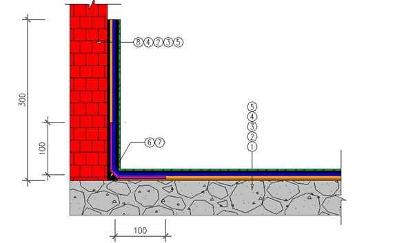 - Thi công lớp thứ nhất DuraLastic S100, định mức 1.25 kg/m2 tại các khu vực góc chân tường trước, ngay khi lớp thứ nhất còn đảm bảo độ dính, trải lớp lưới thủy tinh gia cố (áp dụng khi chân tường xây bằng gạch) và cán đều sau đó thi công các khu vực khác. Chú ý bảo vệ bề mặt cho đến khi lớp màng khô, sau đó phủ lớp thứ 2 DuraLastic S100, định mức 1.25 kg/m2, luôn vén chân tường theo thiết kế.