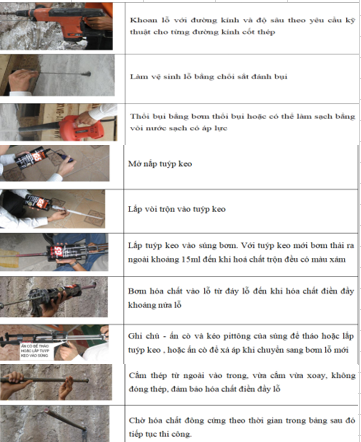 - Bơm hóa chất từ đáy lễ tịnh tiến ra ngoài khoảng 2/3 lỗ. - Lắp đặt cốt thép: đưa cây cốt thép vào nhẹ nhàng theo hình xoắn ốc, đảo chiều đến khi vào hết chiều sâu lỗ.