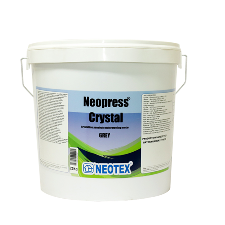 Neopress® Crystal là vật liệu kết tinh gốc xi măng, có thể quét bằng chổi, thích ứng cho cách nhiệt và chống thấm bê tông. Nó lý tưởng ứng dụng cho bể nước, giếng, silo, tầng hầm, đường hầm, tường, cũng như các bề mặt được ốp lát.