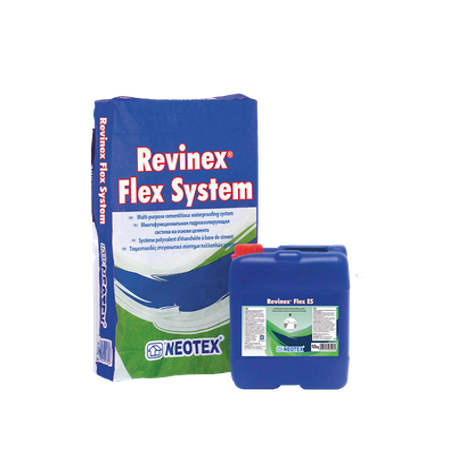 Vật liệu chống thấm gốc xi măng, đa năng, thích ứng cho bê tông, tường xây, dưới lớp gạch ốp lát và các bề mặt khác. Bằng cách trộn lẫn các thành phần của hệ thống, Revinex® Flex(thành phần A) với nước hoặc polyme thích hợp (thành phần B) có thể được sử dụng cho các ứng dụng chống thấm khác nhau tùy theo yêu cầu đặc thù của hạng mục.